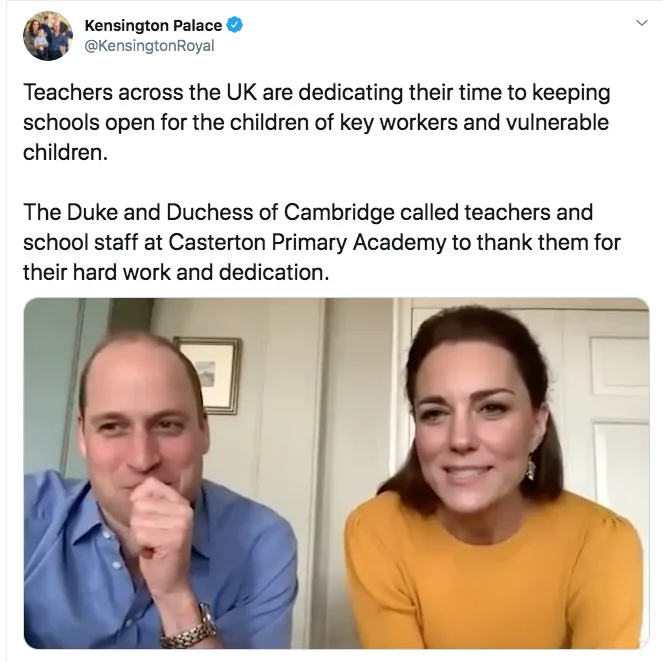 The couple, dialing in from their Norfolk home, Anmer Hall, spoke to staff and youngsters from Casterton Primary Academy in Lancashire, where teachers are helping to look after the children of key workers in frontline services including the NHS and social care, as well as supermarkets and delivery drivers.
