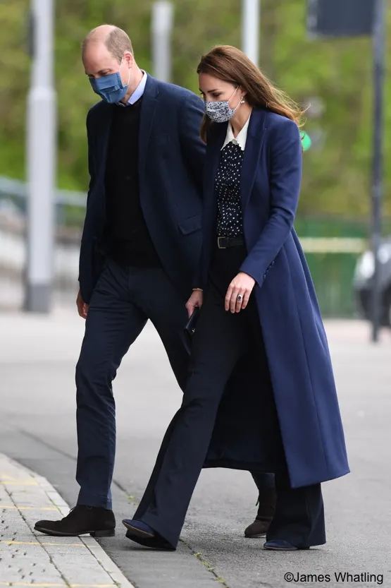 I think Catherine looks great. I don't understand the "swamped" comments. That coat is impeccably tailored, with classic English touches - the armhole high and tight, with narrow sleeves, cut close to the body with the gorgeous flare at the waist in the back. She has the height to carry it off. And it works perfectly with the long tapered trousers. She is wearing them at the length the designer intends them to be worn at. I for one welcome Kate not second guessing her designers. I like the blouse too, the white collar offsets the blues perfectly and the polka dots also add a playful, youthful note. It too is tailored and fits close without being tight. I think monochromatic outfits are very elegant and smart. A way to easily look polished and pulled together without being stuffy and formal.