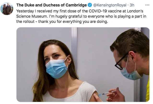 I am back with a couple of updates and things I missed getting into posts during the tour last week. We begin with a photo released over the weekend of the Duchess receiving her first vaccination. Below, the social media post by Kensington Palace on Twitter.