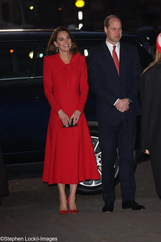 The Duchess of Cambridge wore a vibrant red Catherine Walker coatdress for tonight’s Royal Carols: Together At Christmas concert at Westminster Abbey.