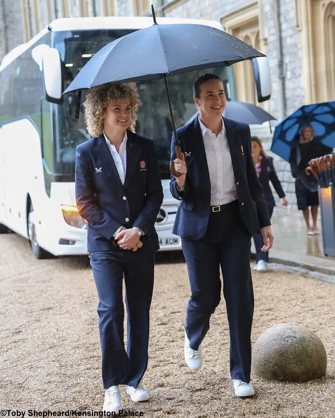 It was gray and rainy in Windsor this afternoon. Players and staff arrived ahead of the reception and were scheduled for a tour of Windsor Castle, but Hello reports their motor coach broke down and that part of the celebration was canceled. Here you see Ellie Kildunne (L) and Emily Scarratt (R) as they arrived.