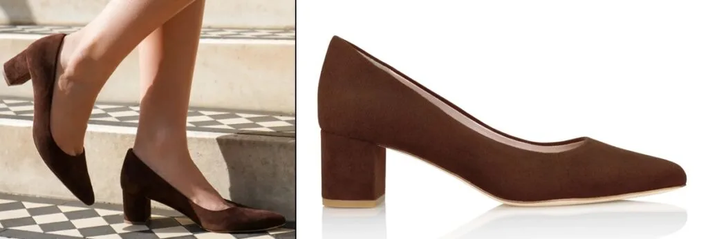 It appears she was in a new pair of shoes that could be by Emmy London (new to us, at any rate), the label’s Josie Mid-Block Heel in chocolate suede. I show it below in the Low-Block heel, because the chocolate isn’t available online in this colorway. Thank you to Middleton Maven for this ID.