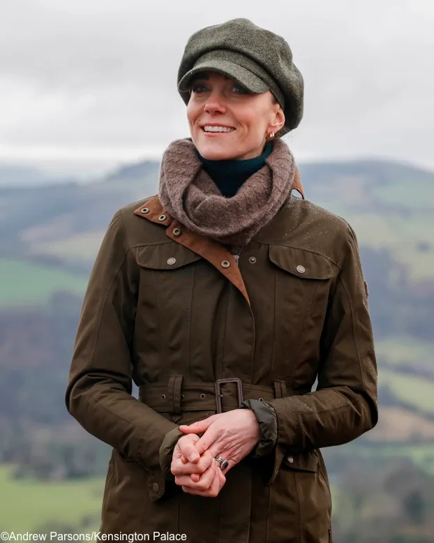 She also had on her past-season grey knit snood from Brora and a baker boy cap that could be the House of Bruar Ladies Tweed 8-Piece Cap, worn in the recent Winter Nature video and shown below left, or her Really Wild past-season style, shown below right.