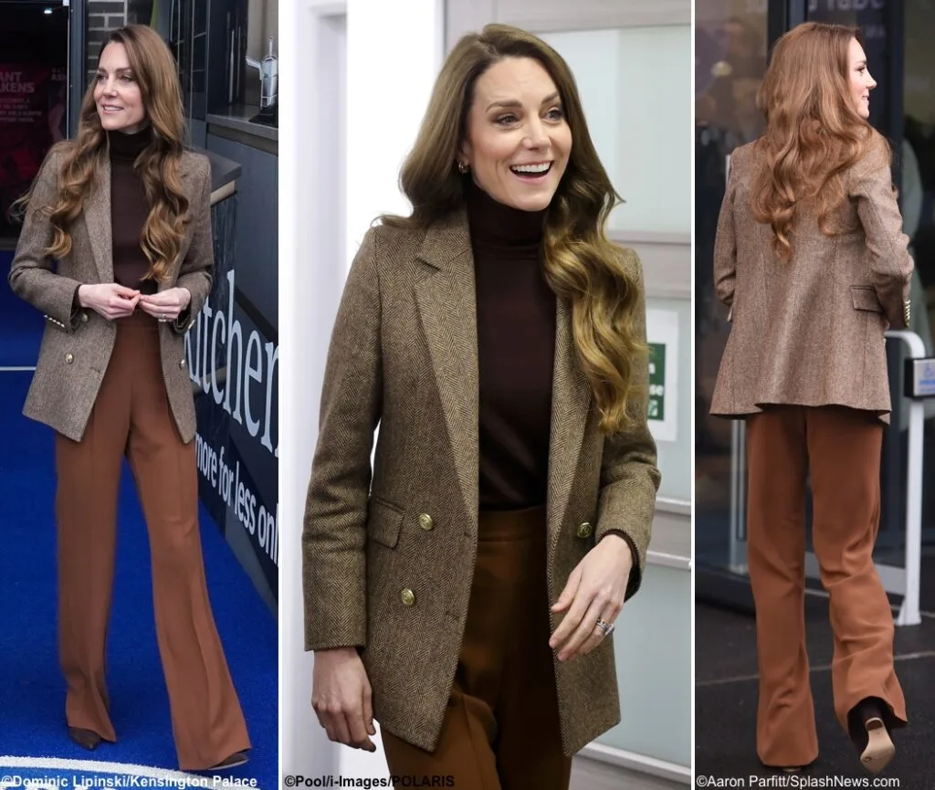 She wore her Large Scale Brown Herringbone Blazer ($929) by Holland Cooper, first noted in April 2025 when the Prince and Princess visited the Isle of Mull. As I wrote last year, “the style is 100% wool with a snug silhouette. It features princess seams, notched lapels, flap pockets, and bold logo buttons.”