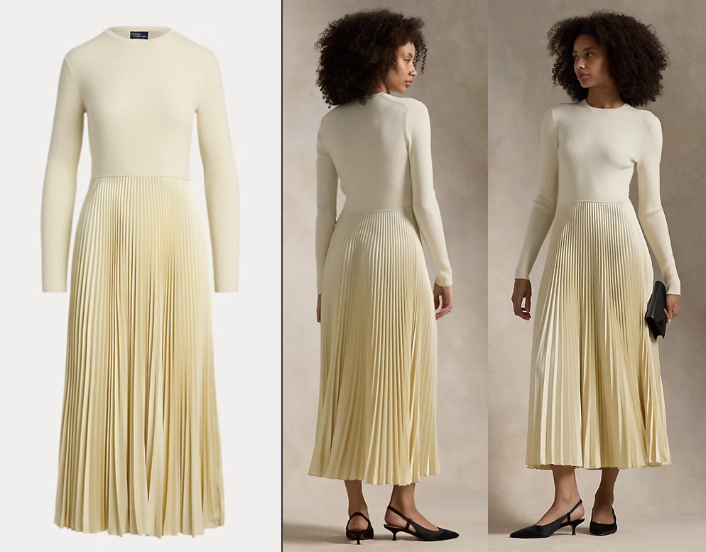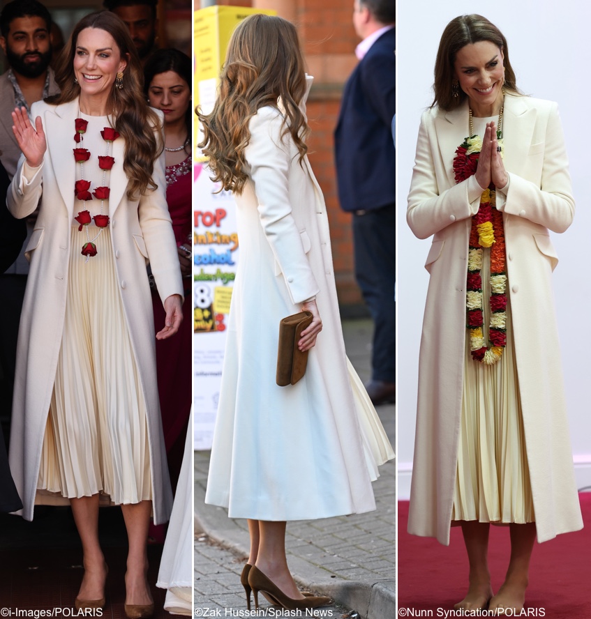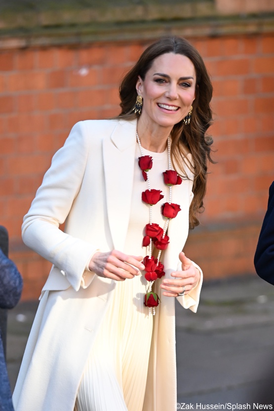 That Chris Kerr coat is seriously fabulous! The outfit Kate wore to the 2023 Christmas carol concert is one of my all time favorite Kate looks. I think the new dress worn today pairs very well with the coat. The pleating on the bottom of the dress is really pretty. Kate’s accessories were on point. I love the brown suede purse/heels and also the earrings. I adore Kate in creamy white. She looks gorgeous and angelic! More of this type of look please!!