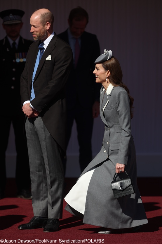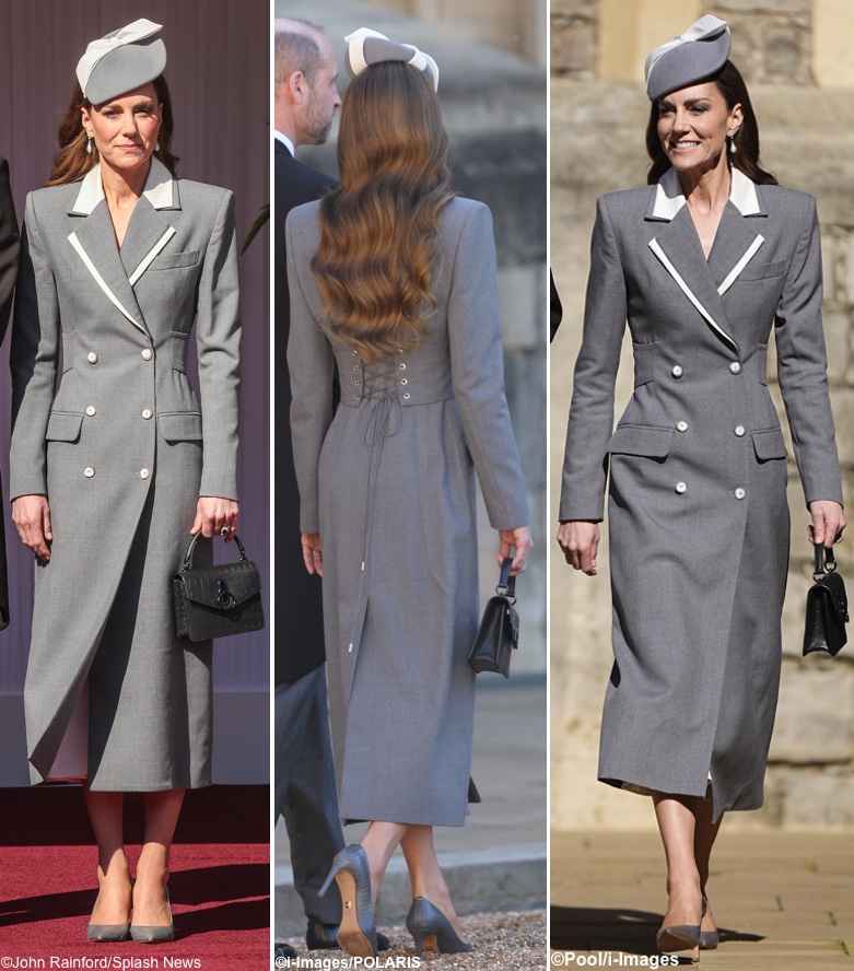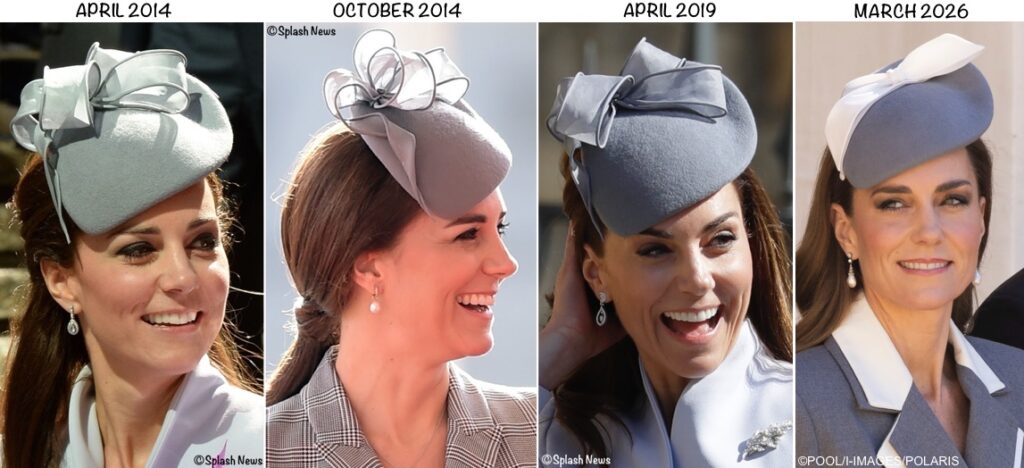 The Princess brought back her ‘Lupin’ hat by Jane Taylor Millinery in grey velour, refreshed with a new bow to coordinate with the details on her coat. The hat was first worn in Australia for Easter 2014 and brought back for the Singapore state visit in October 2014. We saw it again for Easter services in Windsor in April 2019, and then again today. Thank you to Gabi for pointing out that it was the Lupin when many of us were rethinking it was a new chapeau.
