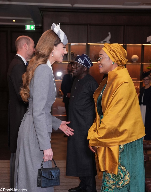 The corset back isn’t for me - this isn’t tailoring as it should be in my opinion. I was surprised at the grey choice but reading it’s from a Nigerian designer it would explain the choice -except if this is from 2024 it can’t have been picked for the occasion unless it was bought recently and the designer had it available. I thought the hat was a rewear. Someone else has commented about the ruched waists and what with the belt yesterday I think it’s becoming clear that there’s now too much fabric in these garments for her very slight frame - she perhaps needs bespoke outfits now although with her advantages I’d have thought alterations could easily be made.