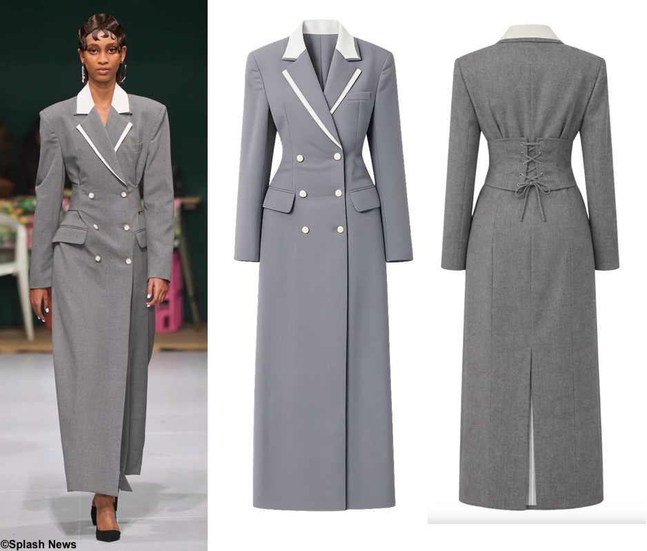 She was in an ensemble featuring the Tolu Coker Double-Breasted Blazer Frock Coat (£1425, roughly $1900 at today’s exchange rates). Part of the designer’s A/W 2024 collection, it was originally called the Double Lapel Corset Coat. It is described this way on the designer’s site: “Balancing sharp tailoring with understated elegance, our Blazer Frock Coat is cut in a longline silhouette with a sculpted waist, strong shoulder and refined double-breasted front. Crafted from 100% British wool, the style is finished with a contrasting double lapel and collar in crisp stretch cotton, bringing subtle distinction to a timeless tailored piece.” Thank you to UFO No More for the ID.
