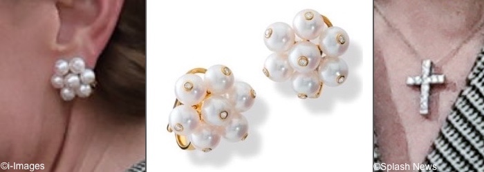 The Princess also wore her Susannah Goad Cavolfiore Earrings ($10200) in 18-carat yellow gold with pearls and diamonds. And she wore the unidentified diamond cross pendant we have seen on several occasions.