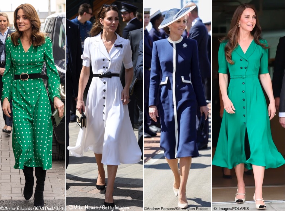 Suzannah is not a new brand for the Princess. She has worn the label many times, including a green-and-white design seen in Galway in March 2020, the Flippy Wiggle Dress in both white (worn multiple times) and green (shown here in May 2023), and the Simple Coat Dress in navy with white trim (seen in November 2025), as well as the Budding Hearts Dress worn in Prince George’s first birthday photos (not shown in this montage).