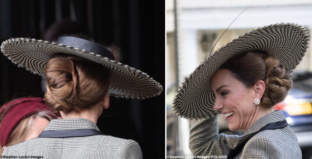 I love the hat, and props to her hair stylist. What an intricate updo. Catherine’s hair looks so wonderful when it is styled in these intricate buns especially when she wears crowns or hats.