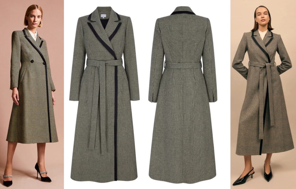 The Washington Prince of Wales Check Cashmere Coat ($3875) is described as “taking inspiration from a vintage hunting coat” and being “Cut from an incredibly soft and warm luxurious cashmere virgin wool blend Italian cloth…with a modern semi-fitted cut, outlined in chic black silk satin and a soft A-line midi skirt.”
