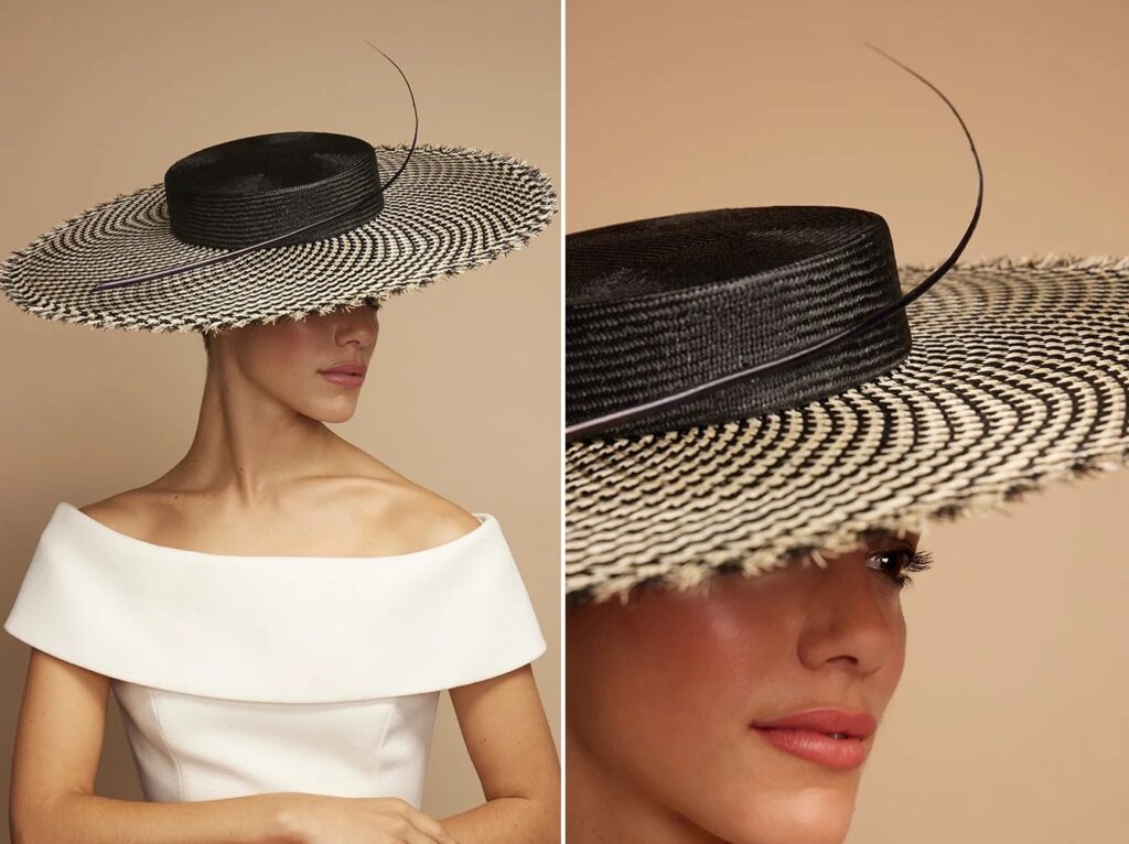 Today’s other new piece was a statement hat by milliner Juliette Botterill. The Houndstooth Straw Boater (£690 roughly $925 at today’s exchange rates). It is crafted from black and ivory houndstooth straw. “Adorned with a single ostrich quill, it’s the perfect blend of classic style and modern flair! The hat is worn on a slim headband with hat elastic, available in your choice of hair colour for a secure and comfortable fit.”