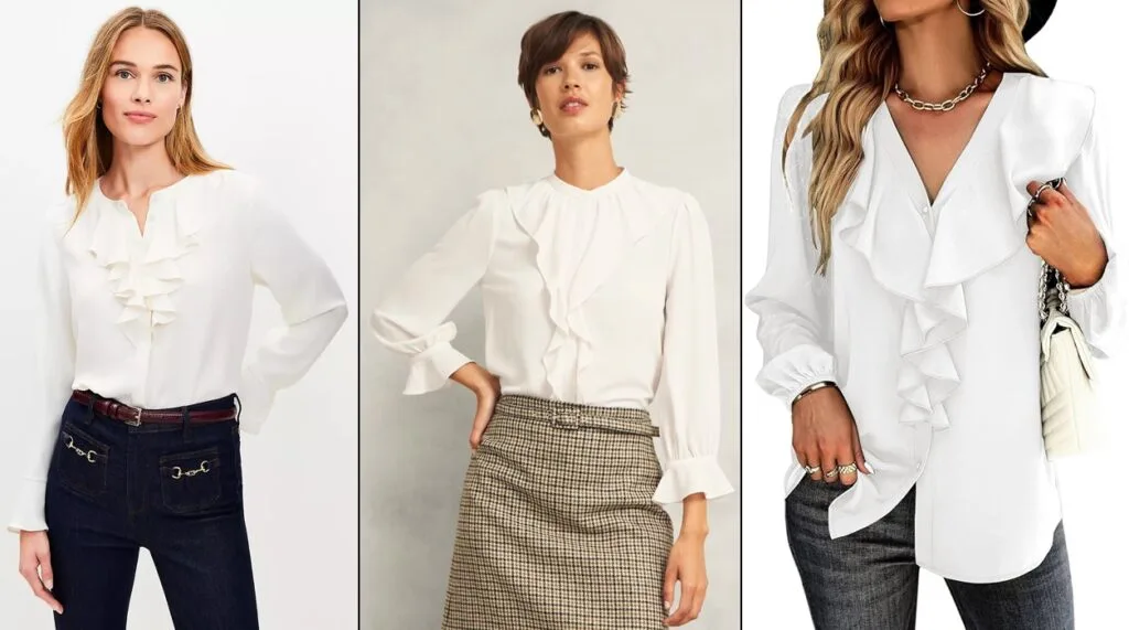 MAY 13: For the Knatchbull Cascade Ruffle Blouse ($595) worn to the British Fashion Awards in mid-May, here are a few possibilities: on the left, the Cascading Ruffle Blouse ($15.95) as sold at Ann Taylor Loft; in the center, the Maribella Blouse ($145) as offered at Hobbs London; on the right, the Vrtige V-Neck Ruffle Front Blouse ($32.99) as stocked at Amazon.