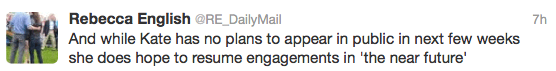 The language used in the statement also puts an end to speculation about twins. Unofficially there is updated information about Kate’s possible return to public appearances schedule, Rebecca English of the Daily Mail posted this on Twitter: