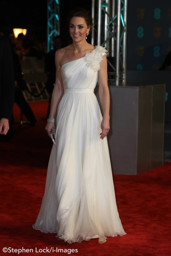 The Duchess wore an elegant one-shouldered gown for tonight’s BAFTA (British Academy of Film and Television Arts) Awards ceremony.