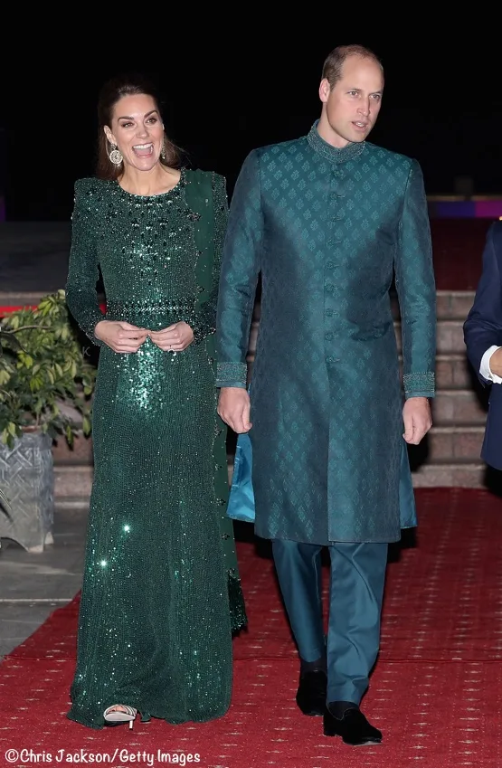 And now for something a little different, a brief foray into what William wore. Like Kate, he wore a hue referencing Pakistan’s national color, green. The Duke was in a traditional sherwani created by Pakistani formalwear label Naushemian by Nauman Arfeen.