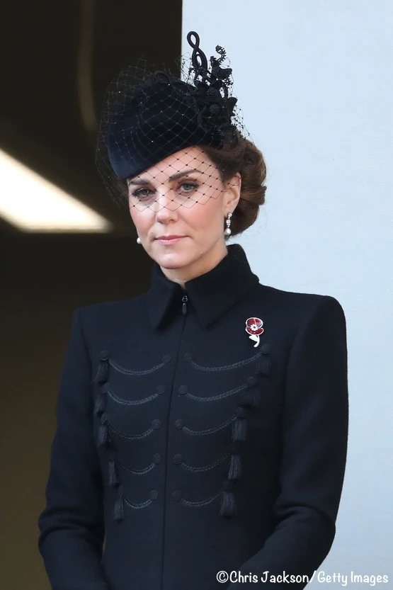 The Duchess wore a new poppy, one that several WKW friends predicted she might wear. It is the Codebreakers Brooch from the Royal British Legion, released earlier this year to honor those who worked in signal intelligence during the Second World War.