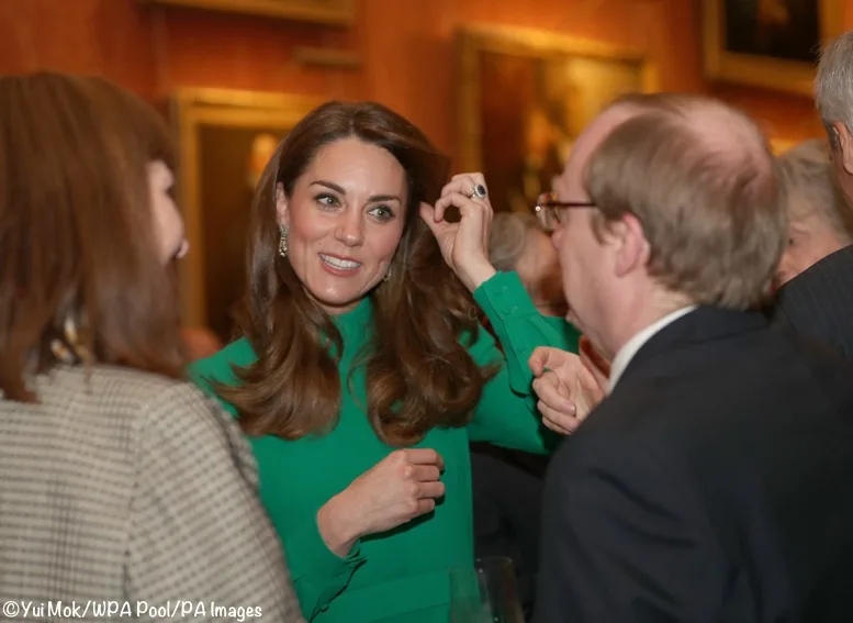 Here is one more photo that shows the Duchess on her way to the Palace for tonight’s reception. Unfortunately, it is of no help in identifying the garment but it does show the way Kate curled her hair.
