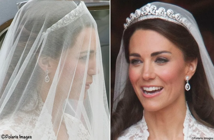 I thought we would go chronologically and start with the Cartier Halo tiara worn for Kate’s wedding in April 2011. Below, two shots of the Duchess: on the left, she is seen on the way to the Abbey, perhaps doing a little deep breathing; on the right, after the service.