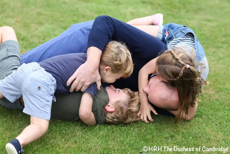 I just love these pics!! And my hat off to the DoC for more wonderful photos! How refreshing to see the children roughhousing with their Dad. And who else thinks Prince Louis looks a lot like his Grandpa Middleton?