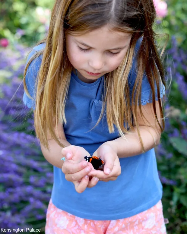The picture, taken by the Duchess, was shared on social media this past Saturday. It shows Charlotte holding a butterfly with a caption that reads, “We wanted to share these beautiful Peacock and Red Admiral butterflies as part of Big #ButterflyCount initiative taking place across the UK.”