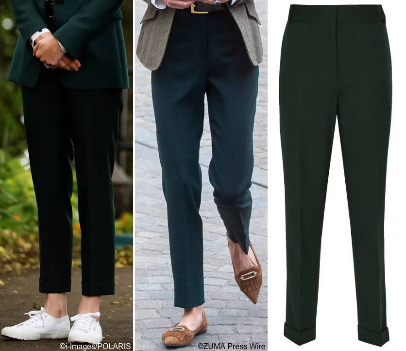I’m not able to tell if the trousers are a dark teal as they appear in some photos, or black, so at this point, they are unidentified. UPDATE SEP 5: A WKW Friend shared an interesting theory last night, and I think she is correct. She believes the trousers worn to the museum are the Reiss ‘Ginnie’ Slim-Leg Trousers seen in Scotland in May 2021, but with the cuff let out. Below left, the trousers in 2021, and in the center, the trousers worn yesterday.