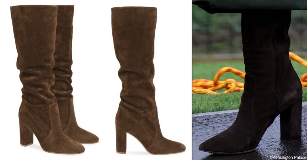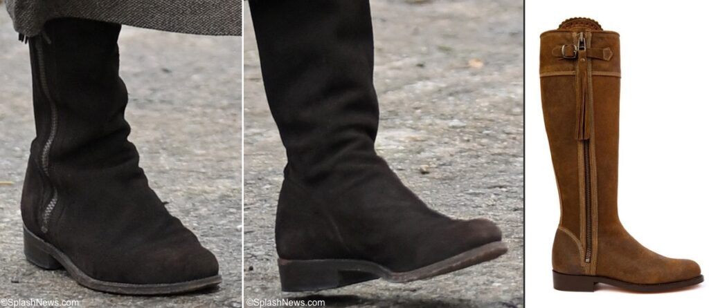 For the visit to the flax farm and orchard, she changed into a different pair of boots. They look like the Penelope Chilvers Riding Tassel Oiled Suede Ladies Boot seen below right in a different color, as sold at William Powell.