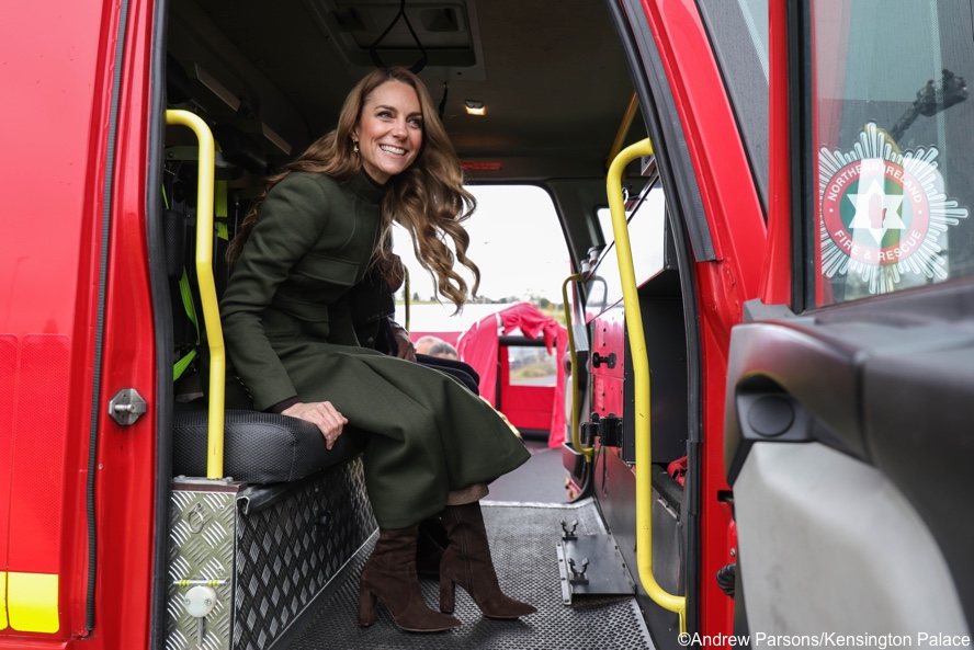 The Prince and Princess began their day with a visit to the Northern Ireland Fire and Rescue Service Learning and Development College in Cookstown. They were given a tour of the site while seated in a fire engine.