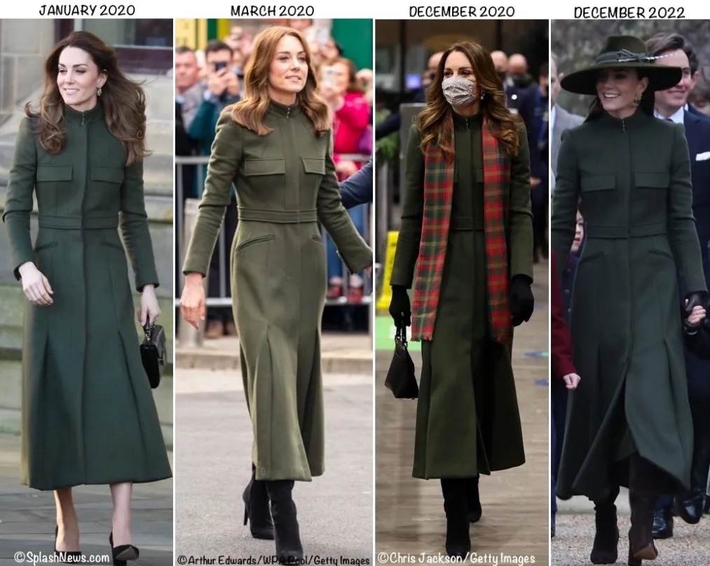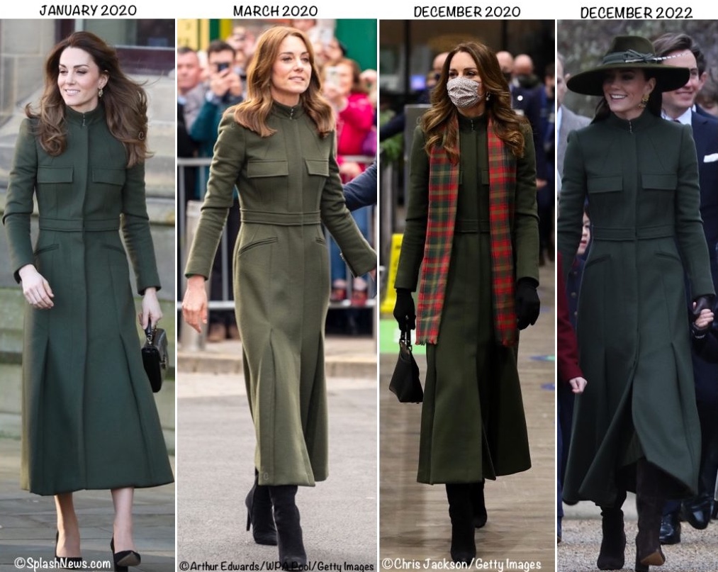 Many readers will have recognized her Alexander McQueen coat. It is a bespoke piece inspired by military styling, worn on multiple occasions, most recently on Christmas Day in 2020. It was first noted during a January 2020 visit to Bradford, seen again in Galway in March 2020, at the launch of a train tour in December 2020, and, most recently, worn on Christmas Day 2022.