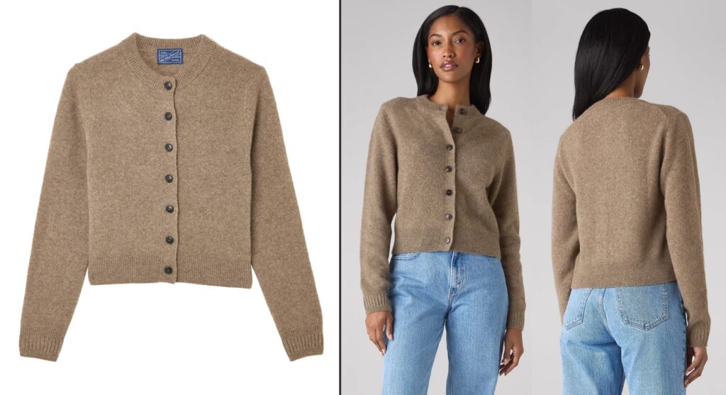 She debuted a WNU (With Nothing Underneath) sweater we hadn’t seen her wear before —the British brand’s Jura Cardigan ($290). It is described as being made from “…ethically sourced yak wool from high-altitude herds on the Tibetan Plateau,” with fully biodegradable buttons. The piece is slightly cropped and has a slim fit, with ribbing at the cuff, collar, and hem. Thank you to Middleton Maven for this speedy ID. She also wore the Ralph Lauren Evilyn Birdseye Tweed Skirt ($1890) from the Ralph Lauren Collection line, which was first noted during the US state visit to the UK.