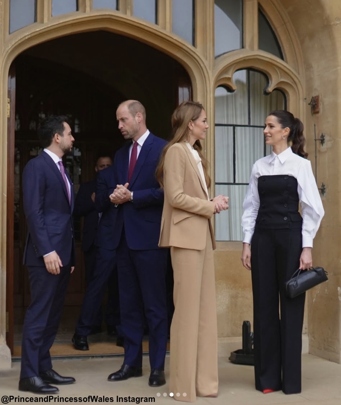 As to Catherine, and What She Wore, for This engagement, at least she refrained from wearing a very odd outfit, such as the one her Royal Guest, Princess Rajwa, wore.