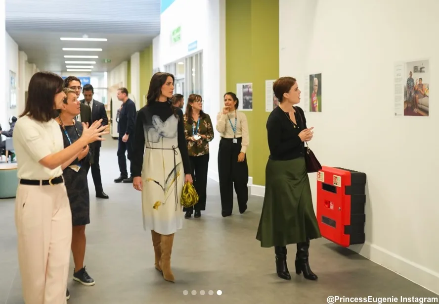 Yesterday, Princess Rajwa joined another royal family member, Princess Eugenie, for engagements showcasing ways artwork is integrated into mental health wards at hospitals in London.