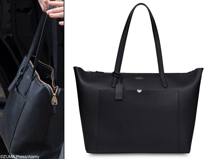 The Princess accessorized with her Smythson East West Tote Bag ($850). The tote measures roughly 14″ x 11″ x 6″ and has an internal slip pocket as well as an external pocket.