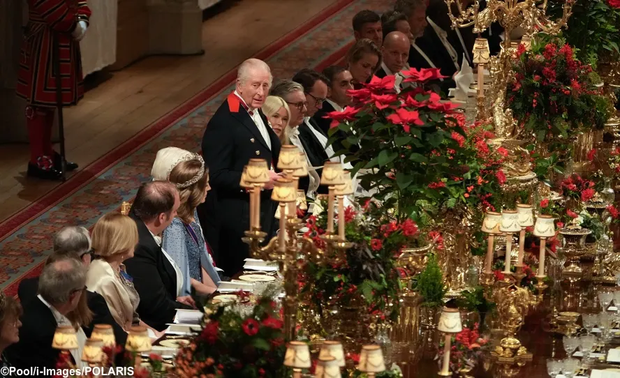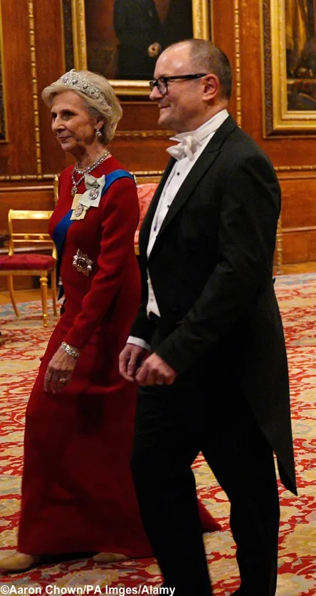 The banquet honoring Germany’s state visit to the UK was held in St. George’s Hall at Windsor Castle. (Buckingham Palace refurbishing precludes holding events there at this time.) Below, the King, Queen, German President Frank-Walter Steinmeier, and his wife, Elke Büdenbender.