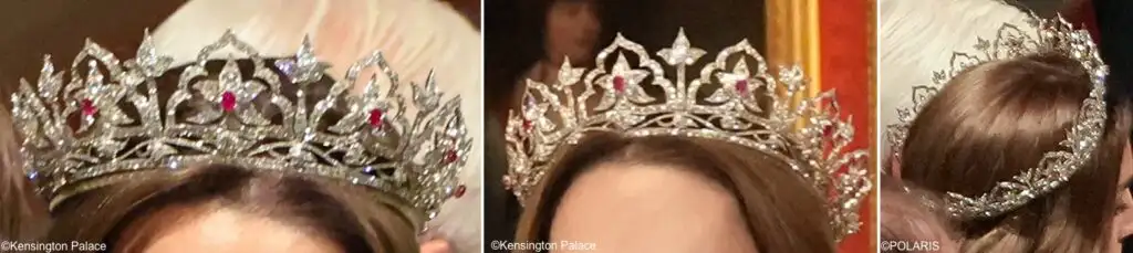 It was originally set with opals, which Garrard says were one of his favourite gemstones. In 1902, Queen Alexandra had the opals replaced with rubies. She is believed to have worn it once, on a state visit to Germany, which could explain why it was worn tonight by the Princess of Wales to the state banquet of the German President.