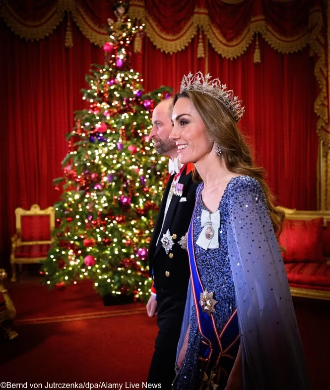 And now for the Princess of Wales. She wore a shimmering bespoke Jenny Packham caped gown featuring an asymmetric neckline, fitted bodice with pleating at the waist, padded shoulders, and sheer cape. The dress’s fabric is embellished with sequins and crystals in an ombré pattern, while the tulle is only lightly covered in sequins.