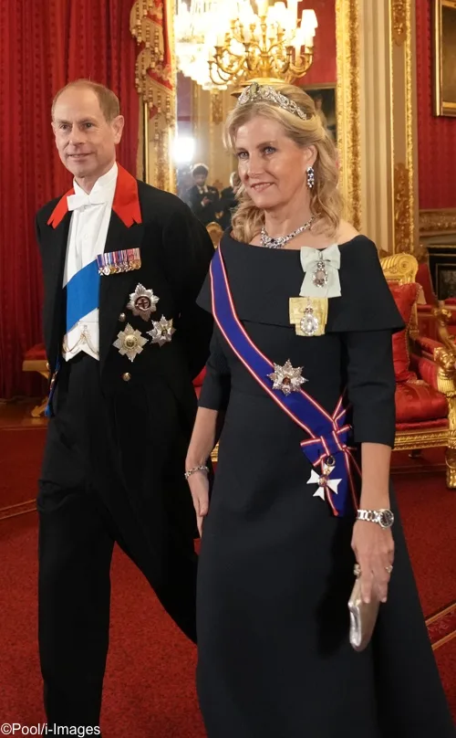The Duchess of Edinburgh was in a bespoke gown by Suzannah London, accessorized by the Wessex Aquamarine tiara, and her Graff Nuage sapphire and diamond flower earrings and necklace, and an Anya Hindmarch “Maud” clutch.