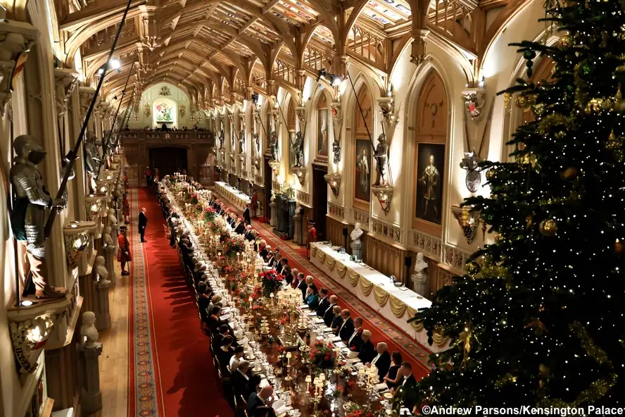St. George’s Hall at Windsor Castle also featured a special holiday touch for the German state banquet: a Christmas tree adorned with lights and gold ornaments!