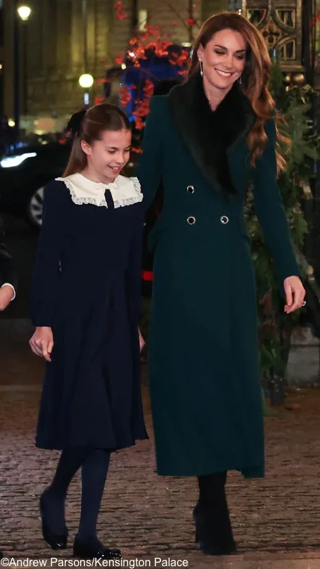 The Princess of Wales was in festive green and red for tonight’s ‘Together at Christmas’ Carol Service at Westminster Abbey.