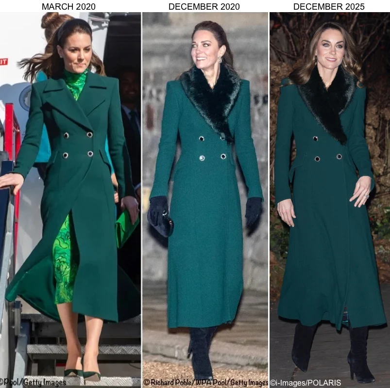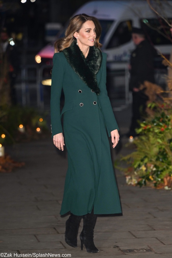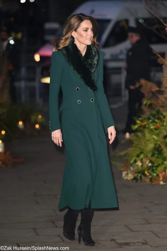 Now, for our look at what Kate wore for this year’s concert. Her bespoke Catherine Walker coat features a double-breasted fit-and-flare silhouette with angled front pockets, a slight flare at the sleeve cuff, and a back vent. The Princess also wore her Faux Fur Lapel Collar in Forest Green by Troy London.