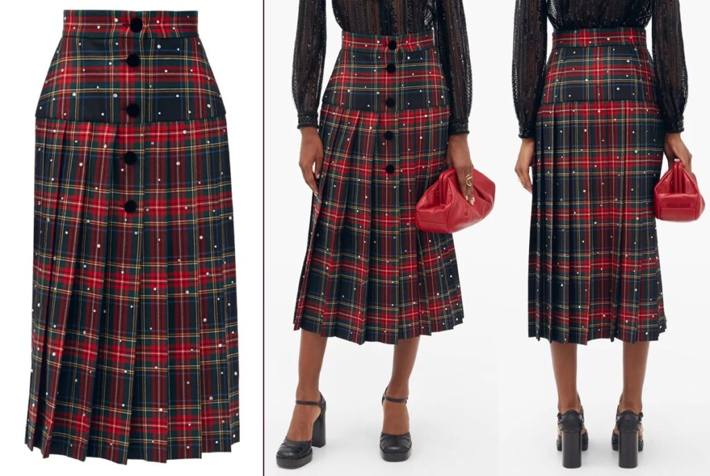 It looked like the Princess debuted a new skirt by Miu Miu, the brand’s Crystal-Embellished Pleated Wool Tartan Midi Skirt. Made in 100% wool, the piece has a high waist with a dropped-waist panel that descends into pleats. The fabric is dotted with clear crystals, and the skirt has a row of black velvet buttons.