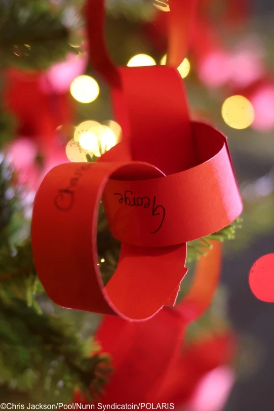 The smartly dressed trio hung loops of red paper bearing their handwritten names on a “Connection Tree”. It represents togetherness and the importance of moments of connection, and was covered with paper chains created as each guest left a loop with their name.