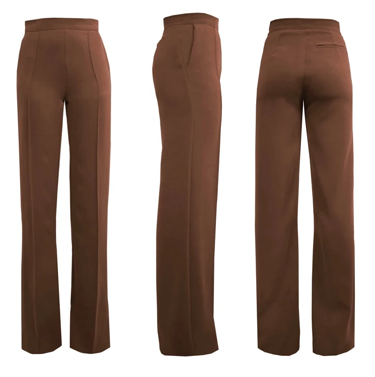 It looks like the label’s Averill style ($970) in brown georgette, described as a “Mid-weight fabric with a smooth drape” that is 100% polyester. The style features side-seam pockets, a back welt pocket, and the distinctive center-front seam.