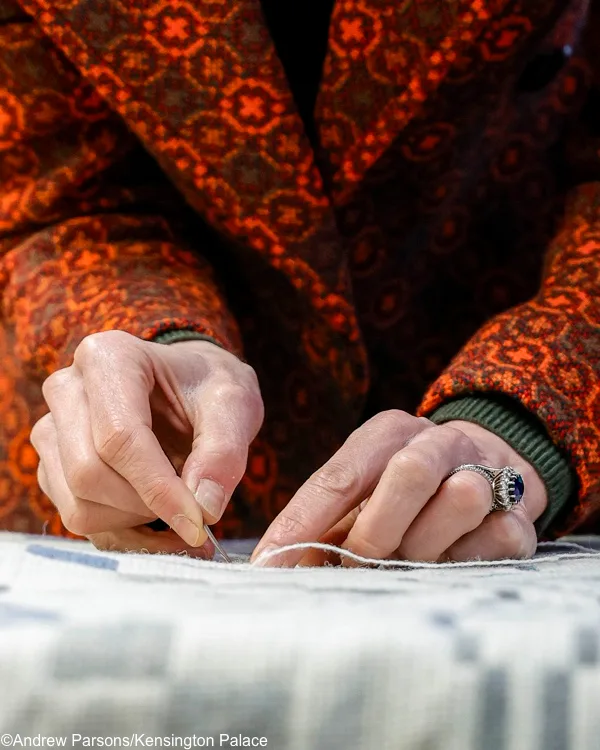 When the Princess of Wales was taken into the “mending shed,” she picked out some designs that she clearly had seen in her research. Clarke adds, “She had a go at the mending, she started the loom, and she tied a knot. So by the time we came out of mending, I said to her, ‘You could be our new apprentice.’ She had a go at a few things!”