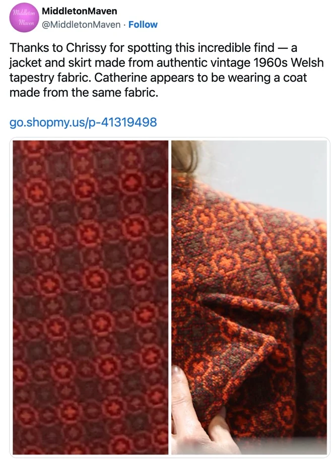 Her coat appears to be made from vintage Melin Tregwynt fabric, a tapestry wool in the Vintage Rose pattern. Thank you to ace IDer Chrissy for sharing a vintage fabric listing with Middleton Maven, which she posted online.