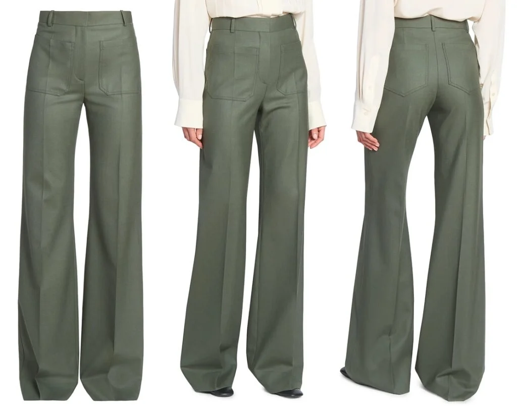 The Princess wore a new pair of Victoria Beckham trousers, the brand’s ‘Alina’ Twill Wide-Leg style in ‘oregano,’ a design inspired by 1970s trends. The style is crafted from a virgin wool/polyester blend with a touch of elastane for stretch and ease of movement, featuring a very high waist, wide-leg silhouette, front and back patch pockets, front zipper, and belt loops.