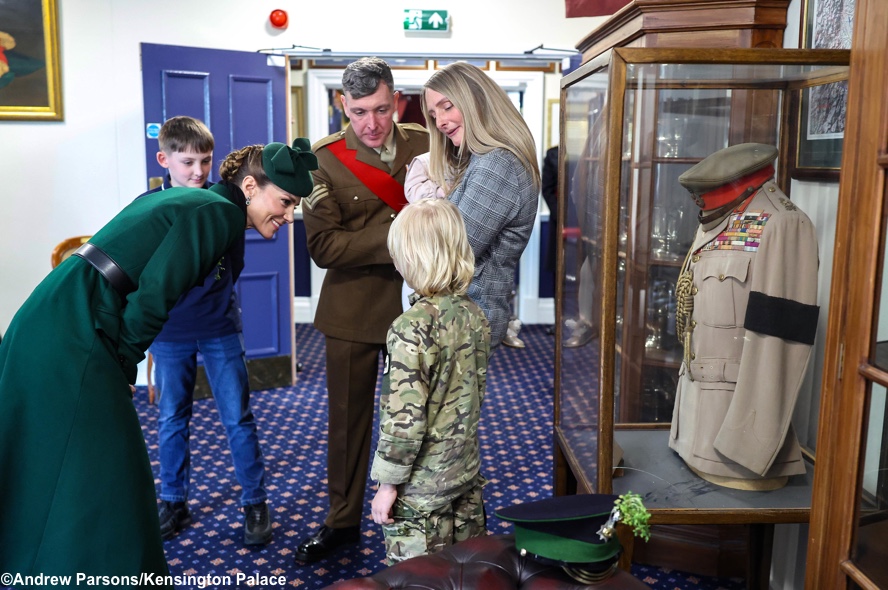 A very cute moment in the Sgt’s Mess at Mons Barracks, Aldershot, where The Princess of Wales met Irish Guards families after the St Patrick’s Day Parade ☘️
