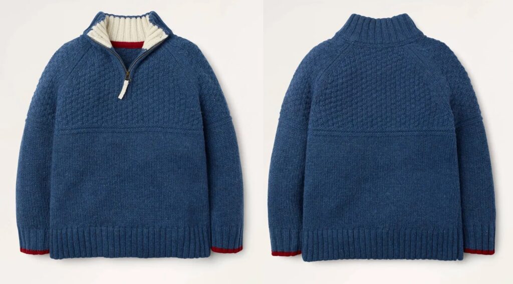In today’s photo, Royal British Fashion suggests the Prince is wearing a past-season Mini Boden sweater. It was described as being “knitted from a snuggly blended yarn that’s rich in lambswool. The soft high collar and half-zip closure work hard to keep warmth in, while ribbing on the cuffs and hem adds extra coziness.”