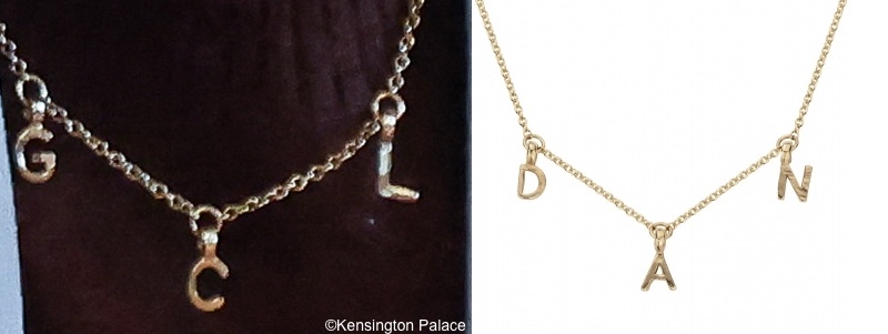 The Princess wore her Daniella Draper Gold Fixed Alphabet Necklace, a style made in the UK of 100% recycled solid 9ct yellow gold. It features the initials for the couple’s children, Prince George, Princess Charlotte, and Prince Louis.